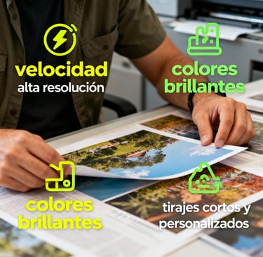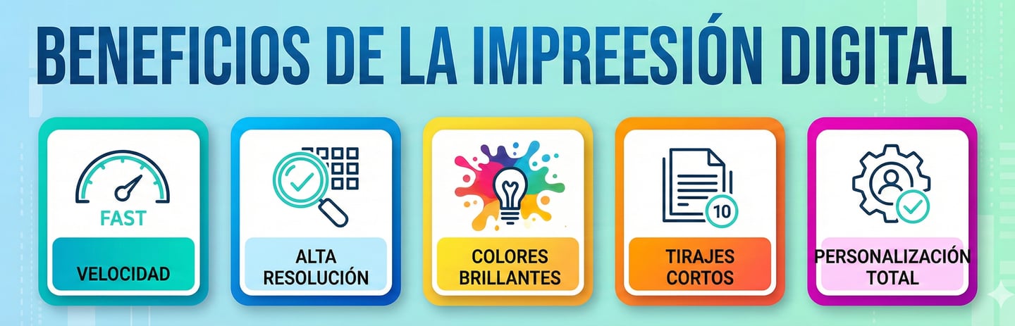 La impresión digital es un proceso directo desde archivo a material, ideal para obtener colores brillantes, alta resolución, tirajes cortos o grandes, y entregas urgentes sin perder calidad.